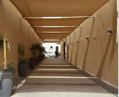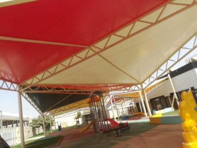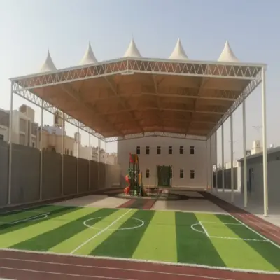مظلات أنيقة مصنوعة من قماش PVC أو PVDF عالي الجودة، مقاومة للأشعة فوق البنفسجية والأمطار، وتأتي بألوان متعددة لتتوافق مع شعار المدرسة وهوية مبانيها.