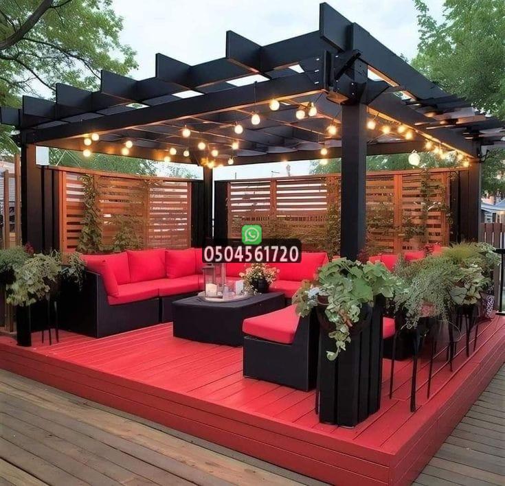 - دمج الإضاءة المخفية داخل سقف البرجولة الحديدية لإضاءة ليلية ساحرة.