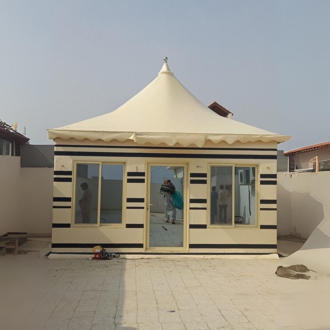 يتم بعد ذلك تركيب الإطار المعدني للبيت بعناية فائقة، مع التأكد من أن جميع الأجزاء متصلة بشكل صحيح. يضمن هذا الهيكل المتين قدرة البيت على تحمل الرياح والأمطار، مع المحافظة على شكله الفاخر والجمالي.