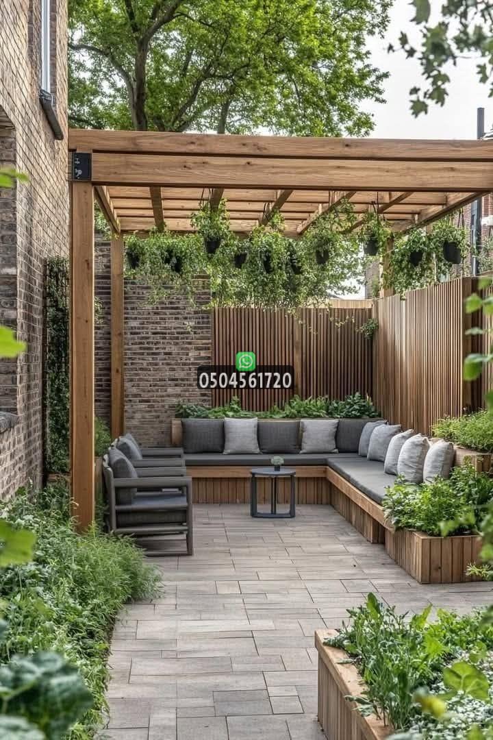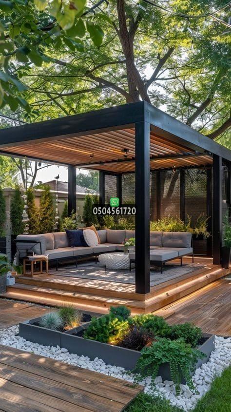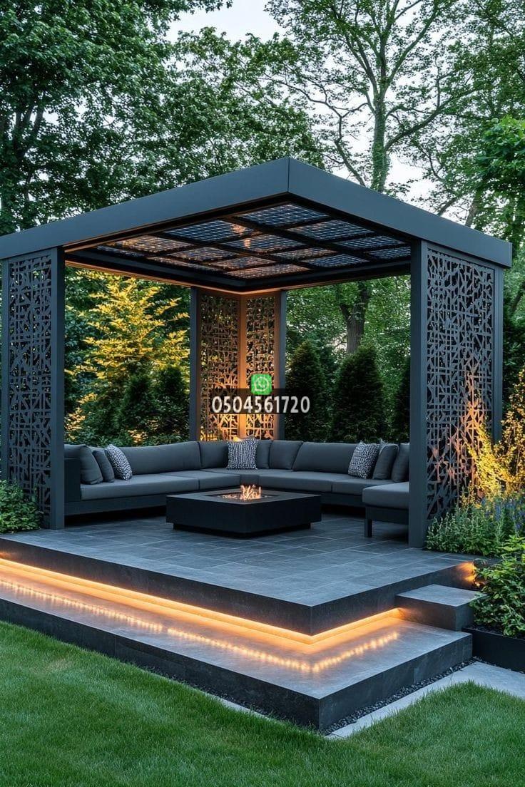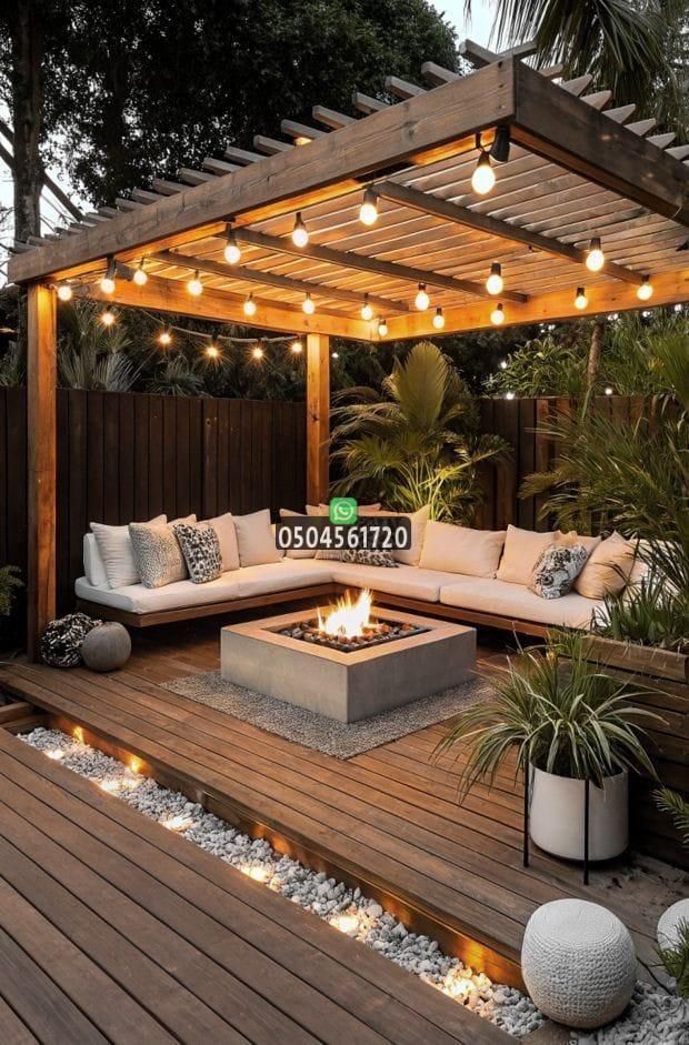 يمكن دمج الإضاءة المخفية والنباتات المتسلقة حول البرجولة لتتحول إلى مساحة مريحة ومثالية للجلسات الليلية.