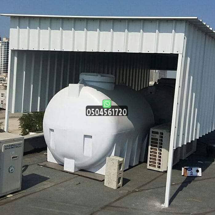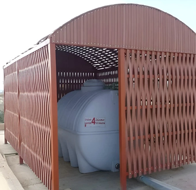 - تستخدم المظلات لحماية خزانات المياه في المجمعات التجارية، والمكاتب، والفنادق، للحفاظ على جودة المياه وتقليل تكاليف الصيانة.
